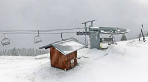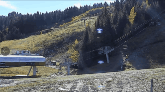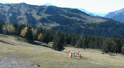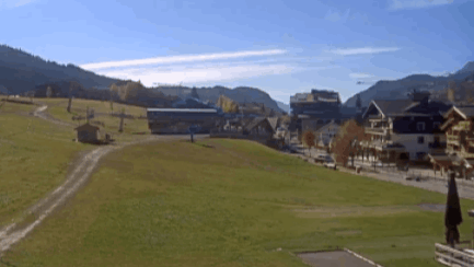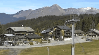 Mont Blanc is visible from a number of the higher points in the area. Parapentes regularly take off from Super Morzine on the mountain above and behind the camera - a parapente landing ground is just opposite, under the tree line. Better views of the Pleney ski slopes can be seen from our other web camera. You can see the slalom slope leading to the lift station from that webcam.